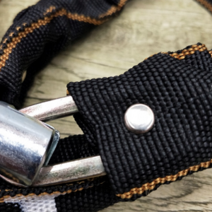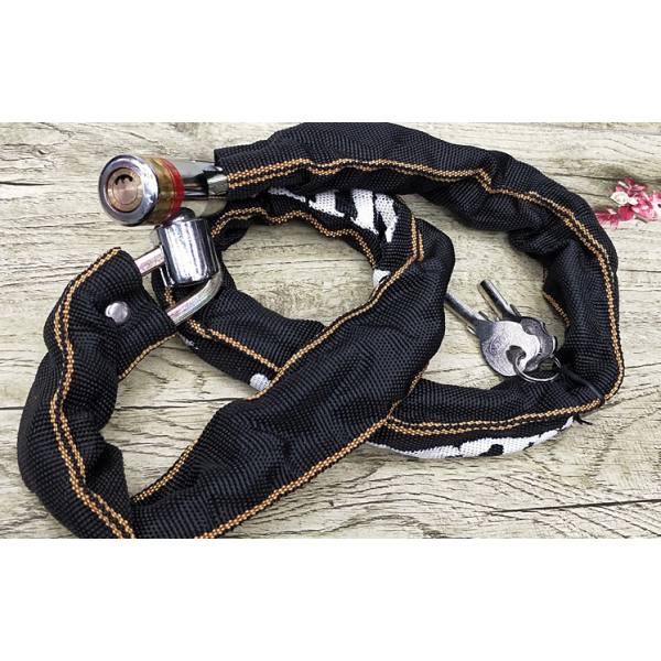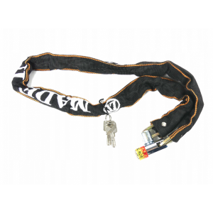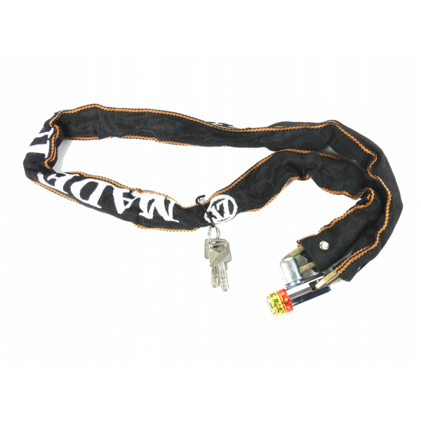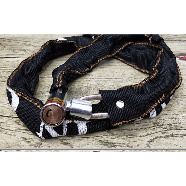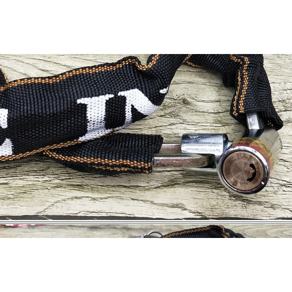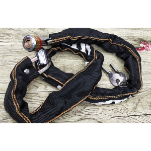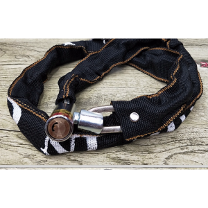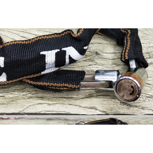 Lanț puternic și solid din oțel călit. A fost acoperit cu un material durabil care o protejează de condițiile meteorologice și protejează suplimentar bicicleta de zgârieturi.