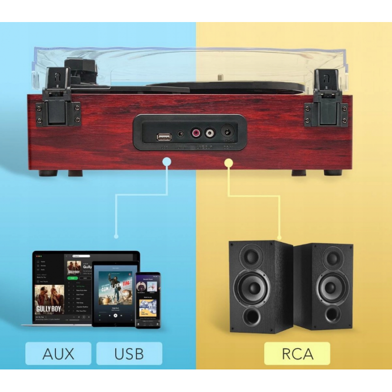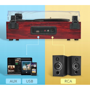 Redați discuri de 7”, 10” și 12” la 33⅓, 45 sau 78 RPM. Conectați telefonul prin bluetooth și aveți o rază de acțiune de până la 10 m. Conectați difuzoare externe prin intrările RCA sau utilizați ieșirea Aux de 3,5 mm pentru a conecta căști. Puteți chiar să conectați un telefon mobil prin portul USB.