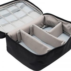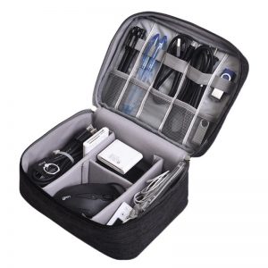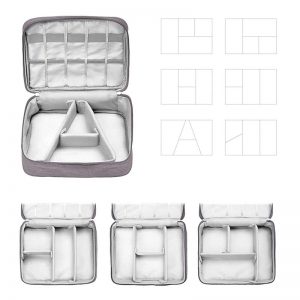 Geanta are o multime de compartimente si file pentru depozitarea incarcatoarelor, powerbank-urilor, cardurilor de memorie, pen drive-urilor sau a altor lucruri mai mici.