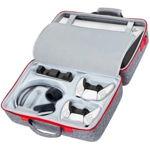 O geanta extrem de practica care va permite sa depozitati si sa transportati in siguranta consola si accesoriile PlayStation 5. Protejeaza PS5-ul impotriva deteriorarii accidentale si faciliteaza transportul consolei si accesoriilor acesteia atunci cand calatoriti. Geanta va permite sa transportati consola si accesoriile in doua compartimente separate. Are un maner dedicat pentru a transporta husa ca o geanta clasica. Este inclusa o curea suplimentara pentru transportul pe umar!