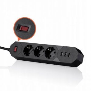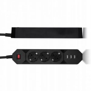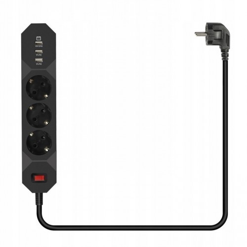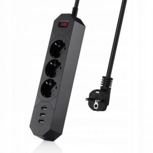Prelungitor cu priza multipla, 3 posturi, 3 porturi USB, negru