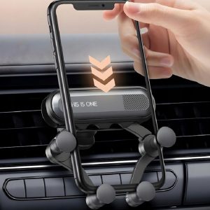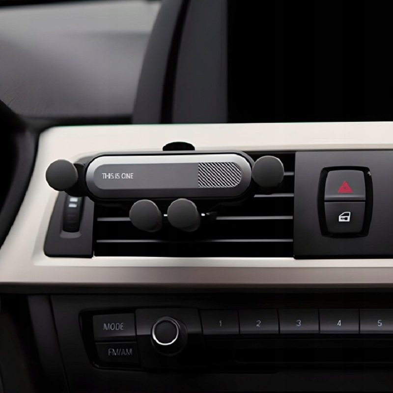 Suport auto gravitational pentru smartphone-uri cu ecrane de la 4” la 6,8”, atasat la orificiul de aerisire al masinii.